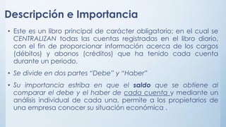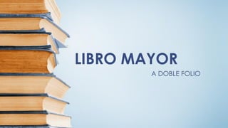 El libro mayor a doble folio es un libro principal y obligatorio donde se centralizan todas las cuentas del libro diario. Se divide en dos partes, "Debe" y "Haber", y permite conocer la situación económica de una empresa al comparar los saldos de cada cuenta. Toma las partidas del libro diario y asigna cada cuenta a los folios izquierdo ("Debe") o derecho ("Haber"), anotando la fecha, contracuenta y número de partida.