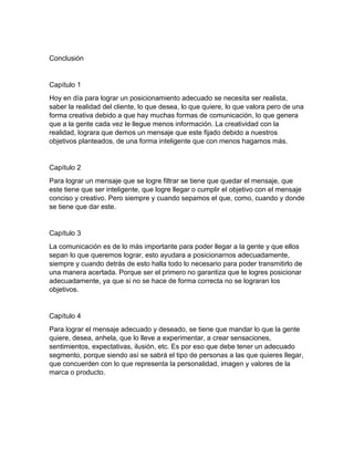 El documento resume los principales puntos discutidos en los primeros cinco capítulos de un libro sobre posicionamiento. Explica que el posicionamiento se trata de manipular la información ya presente en la mente de las personas en lugar de crear algo completamente nuevo. También destaca que en la actualidad hay mucha sobrecomunicación, por lo que es importante enviar mensajes concisos y creativos que logren filtrarse. Además, enfatiza la importancia de comprender las necesidades y deseos de los clientes para posicionar de manera efectiva los productos.