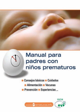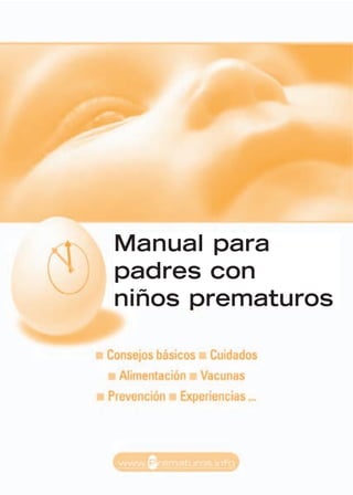 Este manual proporciona información y consejos para padres de niños prematuros. Explica que el nacimiento prematuro supone desafíos emocionales para los padres debido a la separación del bebé y la estancia en la unidad de cuidados intensivos neonatales. El manual cubre temas como el aspecto y cuidados del bebé prematuro durante la hospitalización, las posibilidades de supervivencia y secuelas, y la preparación para el momento de ir a casa. El objetivo es apoyar a los padres a lo largo de este pro