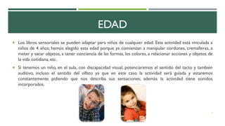 Este documento describe un libro sensorial para niños de 4 años. El libro sensorial tiene como objetivos mejorar la capacidad sensorial a través de la manipulación de objetos y adquirir vocabulario sobre colores, formas y materiales. Incluye materiales como goma eva, fieltro, cordones y corteza de árbol. La actividad es no guiada y los niños pueden usar el libro cuando quieran.