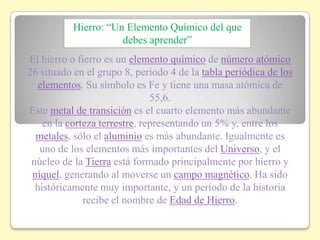 El hierro es un metal de transición abundante en la corteza terrestre. Es el cuarto elemento más común y forma el núcleo de la Tierra junto con el níquel. Históricamente ha sido muy importante y da nombre a un período histórico. El documento proporciona información sobre las propiedades, ubicación en la tabla periódica, estructura atómica e importancia biológica del hierro.