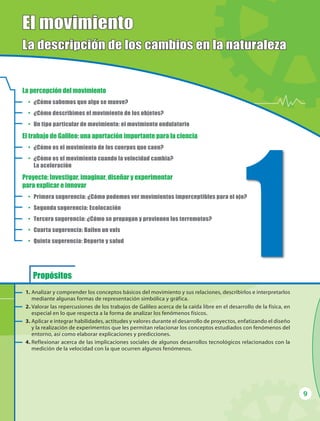 El documento presenta información sobre la percepción y descripción del movimiento. Explica que el movimiento se percibe en relación a un punto de referencia y que depende del marco de referencia desde el cual se observe. También describe diferentes tipos de trayectorias como líneas rectas, circulares, elípticas y parabólicas. Finalmente, introduce conceptos como distancia, desplazamiento, trayectoria y velocidad para describir el movimiento de los objetos.
