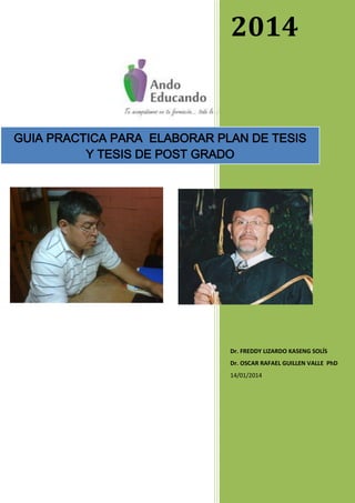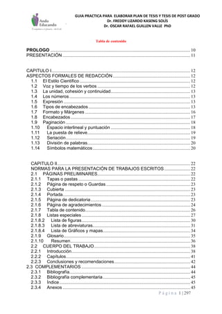 Este documento proporciona una guía práctica para elaborar planes de tesis y tesis de postgrado. Explica aspectos formales de redacción como el estilo científico, formato, encabezados, citas y referencias bibliográficas. Además, incluye normas para la presentación de trabajos escritos como páginas preliminares, contenido del cuerpo del trabajo y secciones complementarias. Finalmente, ofrece ejemplos de citas y referencias bibliográficas según diferentes tipos de publicaciones e Internet.