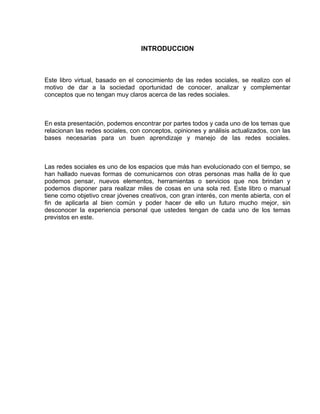 Este documento presenta una introducción y contenido sobre las redes sociales. Incluye una sección sobre el concepto de redes sociales, sus características como ventajas y desventajas, la historia de las principales redes sociales, y el uso pedagógico de las redes sociales. El documento proporciona información básica sobre las redes sociales de una manera concisa y organizada.