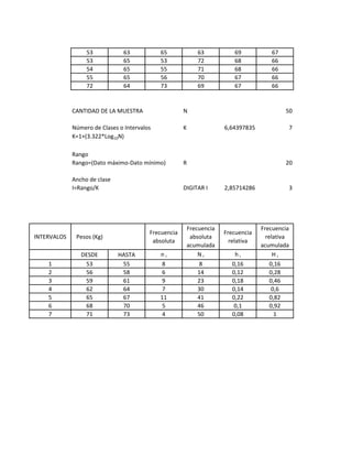 El documento presenta los resultados de un estudio estadístico sobre el peso de una muestra de 50 personas. La información se agrupó en 6 intervalos de aproximadamente 3 unidades entre 53 y 73 kg. La frecuencia absoluta y relativa muestra que el 16% de la muestra pesaba entre 53 y 55 kg, y el 10% entre 68 y 70 kg.