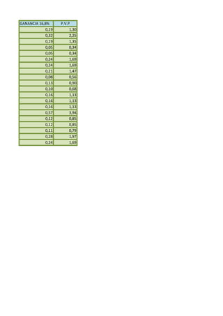 Este documento presenta un listado de artículos de papelería y útiles escolares con su cantidad, precio unitario, descuento del 3.5%, subtotal y ganancia del 16.8% sobre el precio de venta al público. Se enumeran 27 productos diferentes incluyendo cuadernos, libros, lápices, sacapuntas, borradores, cajas de colores, crayones, plastilina, tijeras, marcadores, esferos, cartulinas, carpetas, papel y cartulina.