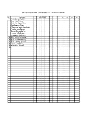 Este documento presenta una lista de 15 estudiantes de la Escuela Normal Superior del Distrito de Barranquilla, incluyendo sus nombres y asistencia a clases. La lista incluye el número de estudiante, nombre, asistencia a clases, y calificaciones en tres asignaturas.