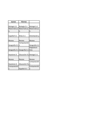 El documento presenta el horario escolar semanal de una clase, con las asignaturas de cada día de la mañana entre las 8:00 y las 14:20. Las asignaturas incluyen biología, matemáticas, español, artes, geografía, francés y educación física. Hay recesos de 10 minutos cada mañana a las 10:00 y 12:40.