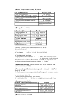 Este documento establece las dotaciones de agua para diferentes tipos de establecimientos y usos. Detalla las dotaciones específicas para viviendas unifamiliares, edificios multifamiliares, establecimientos de hospedaje, restaurantes, locales educacionales, espectáculos, piscinas, oficinas, industrias, estaciones de servicio, alojamiento animales, mataderos, bares, locales de salud y lavanderías. La dotación varía dependiendo del tipo y tamaño del establecimiento.