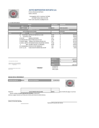 Este documento es una factura emitida por Auto Repuestos Suyapa S.A. a Auto Frenos Boulevard el 22 de septiembre de 2013 por la venta de diversos repuestos automotrices. La factura detalla 10 artículos vendidos con sus respectivas cantidades, códigos, descripciones y precios unitarios, ascendiendo el subtotal a $2,501.50 más un IVA del 15% para un total a pagar de $2,801.68. La factura establece que no se aceptan cambios ni devoluciones y que después de 30 días se cobrar