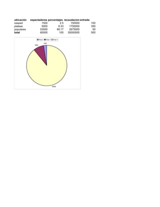 El documento presenta datos sobre la asistencia y recaudación de un evento con diferentes sectores. El césped tuvo 1500 espectadores que representaron el 2.5% de la recaudación total y una recaudación de $150,000. Las plateas tuvieron 5000 espectadores que representaron el 8.33% de la recaudación total y una recaudación de $1,750,000. Los populares tuvieron 53,500 espectadores que representaron el 89.17% restante y una recaudación de $2,675,000.