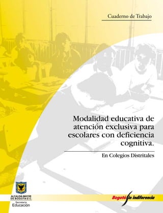 Este documento presenta orientaciones para la modalidad educativa de atención exclusiva para estudiantes con deficiencia cognitiva en colegios distritales. Reconoce los aportes de docentes, directivos y el equipo de apoyo de varios colegios, así como de la Fundación para el Niño Diferente. El objetivo es mejorar la calidad de la educación de estos estudiantes mediante lineamientos pedagógicos, de ingreso, evaluación, promoción y el papel de la familia en el proceso educativo.