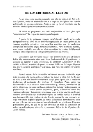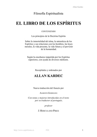 Este documento presenta una introducción al Libro de los Espíritus de Allan Kardec. Explica que el libro contiene los principios de la doctrina espírita según las enseñanzas de los espíritus superiores. También destaca que esta obra es fundamental para el espiritismo y marcó el inicio de esta doctrina. Finalmente, compara el Libro de los Espíritus con otras obras como la Biblia y el Evangelio, señalando que representa la síntesis del mundo moderno de la misma forma que estas otras obras sintetizaron