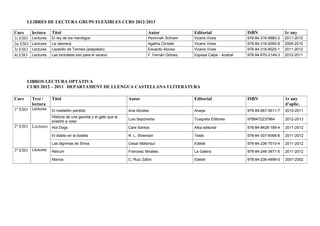 Este documento presenta los libros de texto y lectura recomendados para cada curso del departamento de lengua castellana y literatura para el curso escolar 2012-2013. Incluye los libros de texto para cada curso, las lecturas obligatorias y opcionales seleccionadas, así como los detalles como el título, autor, editorial e ISBN de cada libro.