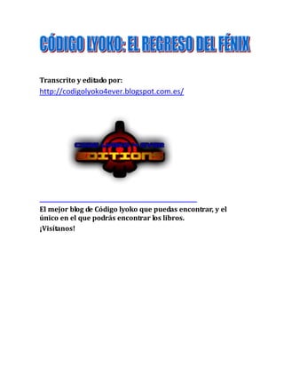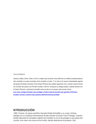 El documento presenta la historia de fondo de los personajes principales de Código Lyoko. Describe cómo el científico Waldo Schaeffer creó el mundo virtual de Lyoko para protegerse de una organización llamada Cartago que quería crear un arma mortal. Más tarde, X.A.N.A. se apodera de la mente de Eva Skinner y comienza a cuestionar su propia naturaleza a medida que experimenta emociones humanas.