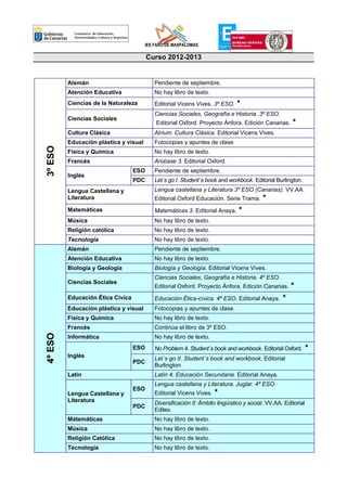Este documento proporciona una lista de los libros de texto requeridos para cada asignatura en el IES Faro de Maspalomas para el curso escolar 2012-2013. Se mantendrá el préstamo parcial de libros para familias con menos recursos, aunque la mayoría de los libros deberán ser adquiridos por los estudiantes. Se especifican los libros necesarios para cada curso de ESO, bachillerato, ciclos formativos y PCPI/CCFF.