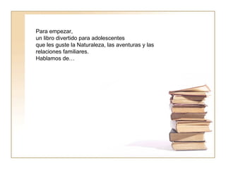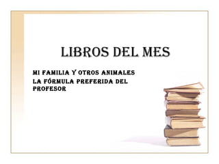 El documento presenta dos libros recomendados para el mes: "Mi familia y otros animales", un libro divertido sobre la naturaleza y las relaciones familiares para adolescentes; y "La fórmula preferida del profesor", un libro premiado sobre matemáticas que cuenta una historia de forma entretenida. Se incluye un enlace a la página web donde se pueden encontrar más referencias sobre estos y otros libros.