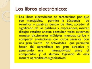 El documento describe los libros electrónicos y el programa Calaméo, el cual permite crear publicaciones web interactivas similares a documentos impresos. Explica que Calaméo permite cargar archivos PDF, personalizar las publicaciones con imágenes y música, y compartir publicaciones de forma pública o privada a través de enlaces. También detalla los pasos para registrarse en Calaméo, subir una publicación, y acceder a publicaciones existentes.