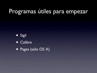 Sigil, Calibre y Pages son programas útiles para crear eBooks. Sigil permite editar archivos ePub de forma gratuita. Calibre puede convertir entre formatos de libros electrónicos. Con Pages de Apple se pueden crear ePub en Mac. El documento también cubre la inclusión de video y audio en ePub, y la creación de archivos mobi para Kindle usando Mobipocket Creator o Calibre. Se mencionan aplicaciones nativas y ejemplos como revistas electrónicas, Safari de O'Reilly y booki.sh.