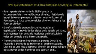 El estudio de los libros históricos del Antiguo Testamento es esencial para comprender la historia de Israel y extraer lecciones morales y espirituales relevantes. Palestina juega un papel importante como el escenario de la revelación de Dios y se divide en cuatro secciones topográficas principales: llanura marítima, cordillera central, valle del Jordán y altiplanicie oriental. Esta región, rica en historia y geografía, ha sido un punto de encuentro de civilizaciones y eventos bíblicos significativos.