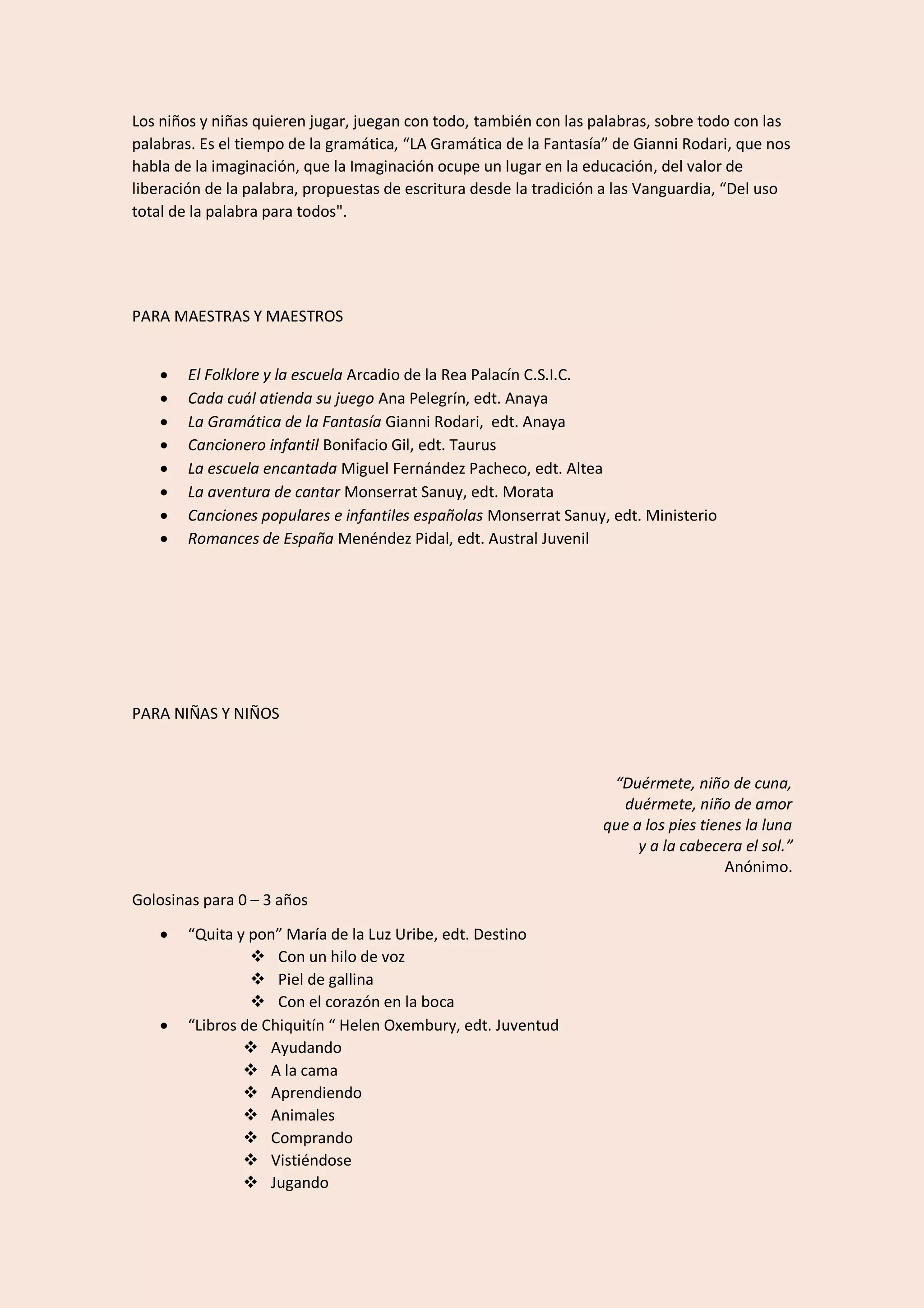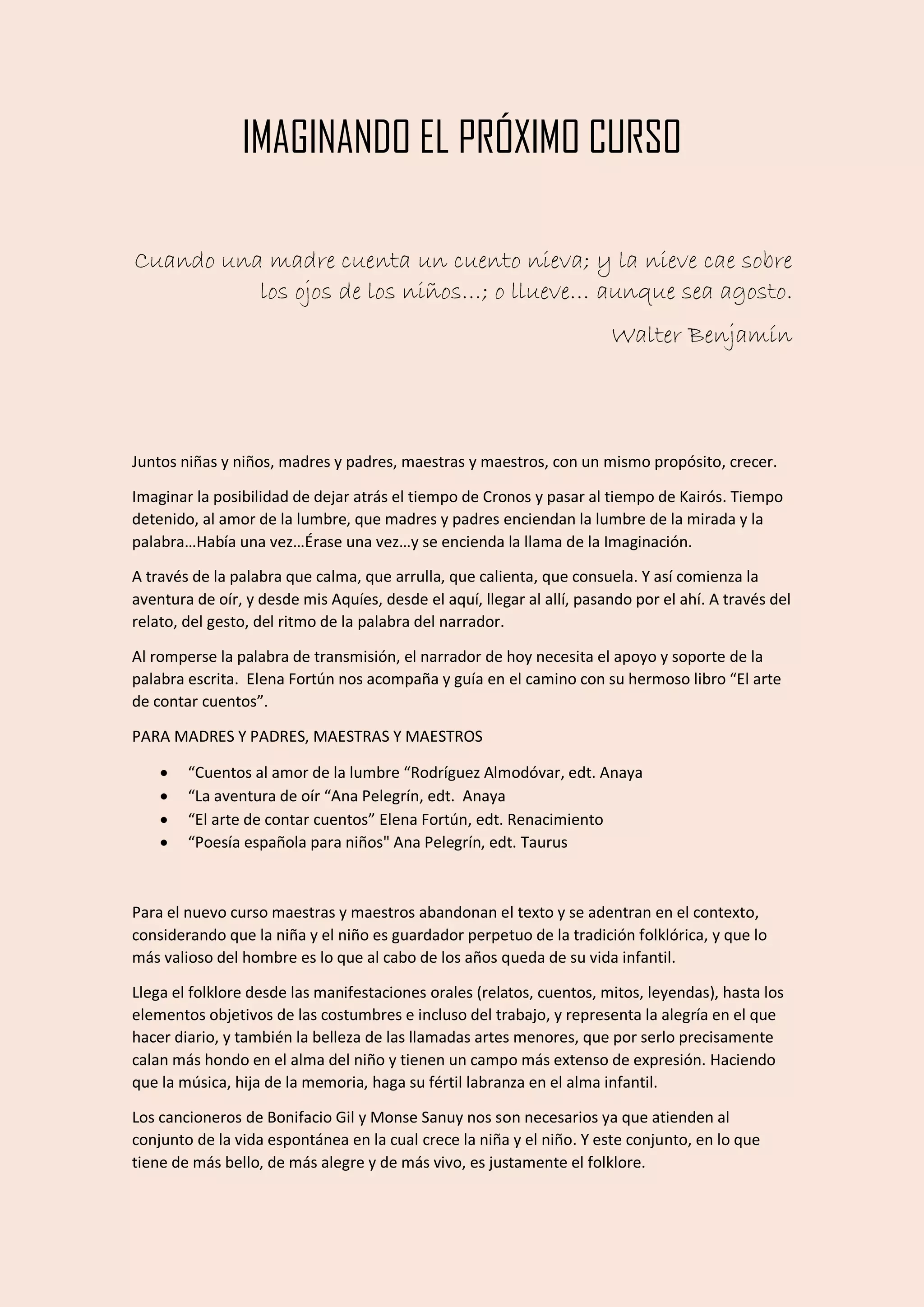 El documento reflexiona sobre el papel de la narración y el folklore en la educación, enfatizando la importancia de contar cuentos para fomentar la imaginación y el desarrollo emocional de los niños. Se mencionan diversas obras y autores que ayudan a guiar a padres y maestros en este proceso, destacando la conexión entre la tradición oral y la literatura contemporánea. Además, se aboga por integrar el folklore y la música en la educación para cultivar el alma infantil.