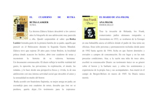 Los documentos presentados tratan sobre libros y memorias relacionados con el Holocausto y la Segunda Guerra Mundial. Muchos son diarios o testimonios escritos por víctimas que narran sus experiencias vividas en campos de concentración nazis o durante la persecución y huida de los judíos de la Europa controlada por Hitler. Otros documentos son novelas inspiradas en estos hechos o que buscan mantener viva la memoria de las víctimas del Holocausto. En general, los textos resaltan la importancia de no olvidar las