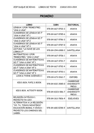 Este documento lista los libros de texto y materiales educativos requeridos para cada grado del CEIP Duque de Rivas para el curso escolar 2013-2014, incluyendo los libros de lengua, matemáticas, religión, inglés y otras asignaturas para educación infantil, primaria y sexto grado.