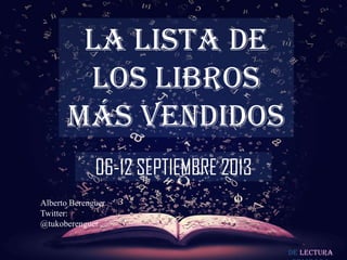 El documento presenta las listas de los libros más vendidos en varios países y formatos (impresos y ebooks) durante la semana del 6 al 12 de septiembre de 2013. Se clasifican los títulos por géneros como ficción, no ficción, y por país de publicación, incluyendo España, Reino Unido, Francia, Alemania, Italia, Canadá y Japón.