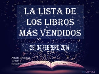 El documento presenta una lista de los libros más vendidos durante el periodo del 29 de abril al 4 de febrero de 2014, organizados en categorías de ficción, no ficción y ebook. Incluye títulos y autores destacados, como "El juego de Ripper" de Isabel Allende y "La ladrona de libros" de Markus Zusak. También se consignan diversas editoriales asociadas con cada libro.