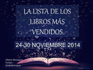 El documento presenta una lista de los libros más vendidos por categorías, incluyendo ficción, no ficción y ebooks, correspondiente a la semana del 24 al 30 de noviembre de 2014. Se mencionan títulos y autores destacados en cada categoría, así como las editoriales que los publican. La lista abarca una amplia variedad de géneros y lenguajes, reflejando las preferencias literarias del momento.