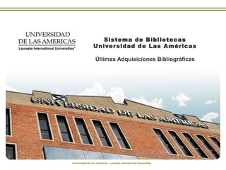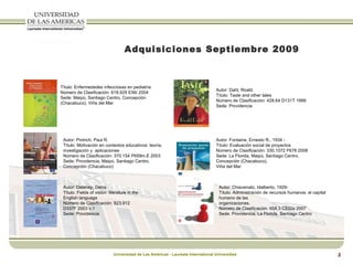 Este documento presenta una lista de las últimas adquisiciones bibliográficas de la biblioteca de la Universidad de Las Américas, incluyendo libros sobre enfermedades pediátricas, motivación educativa, literatura en inglés, cuentos de Roald Dahl, evaluación de proyectos, recursos humanos, geografía de Chile, ortografía, ética educativa, creatividad y lenguaje, didáctica de ciencias sociales, diversidad en el aula, economía de la educación, escritura, diseño educativo, enseñ
