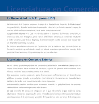 El documento presenta la Licenciatura en Comercio Exterior de la Universidad de la Empresa. En 3 oraciones: La carrera forma profesionales especialistas en comercio exterior con conocimientos actualizados para trabajar en el sector público, privado o por cuenta propia a nivel nacional e internacional. La metodología combina formación teórica con aplicaciones prácticas a través de trabajos. El plan de estudios de 4 años asegura una formación integral en temas como integración económica, marketing internacional, aduanas y comercio electrónico