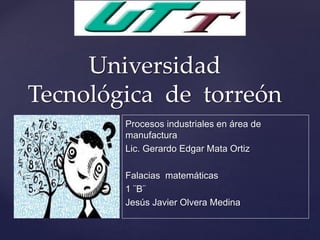 Este documento presenta un ejemplo de una falacia matemática. Explica que una falacia es un argumento aparentemente válido pero que contiene un error lógico. Luego muestra un procedimiento algebraico que conduce a la conclusión 1=0, lo cual es claramente falso. El error está en un paso donde no se respeta la propiedad de igualdad al igualar expresiones que no son iguales.