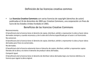 Este documento define las licencias Creative Commons y describe sus beneficios y tipos. Las licencias Creative Commons permiten a los creadores especificar cómo otros pueden usar su obra con derechos de autor, incluidas opciones para usos no comerciales, sin derivados o requiriendo el mismo tipo de licencia para obras derivadas. Existen seis tipos de licencias Creative Commons que varían en estas restricciones.