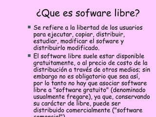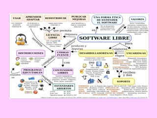 El documento explica los conceptos de software libre, licencias Creative Commons, derecho de autor y diferentes tipos de licencias como GPL, AGPL, BSD y MPL. El software libre permite ejecutar, copiar, distribuir, modificar y redistribuir el software. Las licencias Creative Commons permiten a los autores decidir qué uso autorizan para sus obras a través de contratos simples. El copyleft asegura que las versiones modificadas de una obra mantengan los mismos derechos de uso.