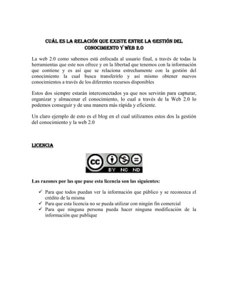 La Web 2.0 y la gestión del conocimiento están estrechamente relacionadas porque la Web 2.0 permite capturar, organizar y almacenar conocimiento de manera rápida y eficiente a través de herramientas como blogs y wikis. Estos recursos de la Web 2.0 son útiles para transferir conocimiento entre usuarios y generar nuevo conocimiento. Un ejemplo claro es cómo los blogs utilizan tanto la gestión del conocimiento como las características interactivas de la Web 2.0.