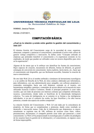La gestión del conocimiento se refiere a crear, organizar, almacenar, compartir y potenciar el conocimiento de una organización. La Web 2.0 proporciona herramientas para crear redes sociales que permiten a las personas compartir información y conocimiento. Esto ha facilitado la gestión del conocimiento al permitir que la información y el conocimiento se compartan fácilmente entre las personas.