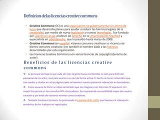 Creative Commons es una organización sin ánimo de lucro que desarrolló varias licencias de copyright para ayudar a reducir las barreras legales de la creatividad. Las licencias Creative Commons permiten a los creadores especificar cómo otros pueden usar, distribuir y construir sobre su trabajo, con opciones como permitir usos no comerciales o requerir el reconocimiento de la autoría. Hay varios tipos de licencias que ofrecen diferentes niveles de permisos.