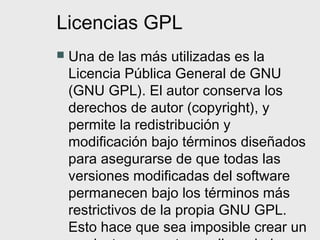 El documento explica las licencias Creative Commons y GPL. La licencia GPL permite la modificación y redistribución de software siempre que sea bajo la misma licencia GPL, lo que significa que cualquier versión modificada también debe ser GPL. Las licencias Creative Commons permiten a los autores decidir qué uso autorizan de sus obras a través de cuatro elementos: atribución, uso comercial, derivados y compartir igual.