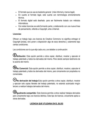Las licencias Creative Commons permiten a los creadores compartir su trabajo y permitir que otros lo usen bajo ciertas condiciones como la atribución, fines no comerciales, o prohibir usos derivados. Ofrecen varias opciones como permitir usos comerciales o derivados siempre que se acredite la autoría original. La licencia de atribución permite copiar y distribuir el trabajo siempre que se reconozca la autoría.