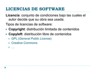 Este documento describe diferentes tipos de licencias de software, incluyendo copyright, copyleft y Creative Commons. Copyright es la licencia más restrictiva que limita la distribución de contenidos. Copyleft permite la distribución y modificación libre de una obra siempre que se mantengan las mismas condiciones de copyleft. Creative Commons es una organización sin fines de lucro que ofrece flexibles licencias copyleft para compartir voluntariamente el trabajo creativo.