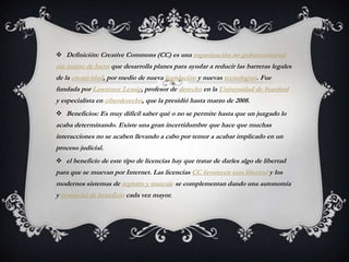 Este documento define Creative Commons y sus beneficios. Creative Commons es una organización que desarrolla licencias para ayudar a reducir las barreras legales de la creatividad. Sus licencias permiten más libertad para compartir contenido en Internet al tiempo que protegen los derechos de autor. El documento luego describe los seis tipos principales de licencias Creative Commons que varían en si permiten uso comercial, modificaciones u otras restricciones.