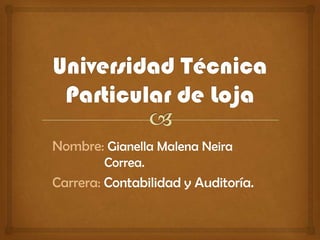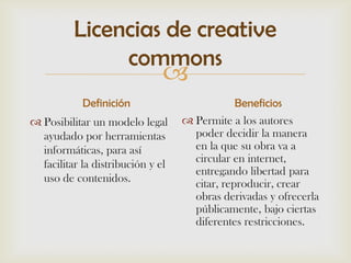 Gianella Malena Neira Correa estudia Contabilidad y Auditoría. El documento define las licencias Creative Commons, explica sus beneficios al permitir que los autores controlen cómo se distribuye y usa su obra en internet, y describe cuatro tipos de licencias: Atribución, No Comercial, No Derivación y Compartir Igualmente.