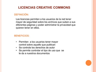 El documento habla sobre las licencias Creative Commons, las cuales permiten a los usuarios tener mayor control sobre los archivos que publican en línea y administrar su privacidad. Entre los beneficios de estas licencias se encuentran el poder controlar los derechos de autor y el tipo de uso de los documentos. El documento también describe los cinco tipos principales de licencias Creative Commons.