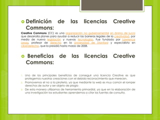 Las licencias Creative Commons permiten a los creadores compartir su trabajo y permitir que otros lo usen bajo ciertas condiciones como dar crédito, no usarlo comercialmente, o no modificarlo. Existen cuatro tipos de licencias Creative Commons: Atribución, No Comercial, No Derivadas, e Igualmente Compartido. Cada una permite diferentes usos del contenido protegido por derechos de autor.