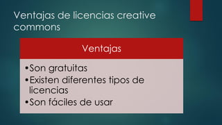 El documento describe las ventajas de las licencias Creative Commons, que incluyen que son gratuitas, existen diferentes tipos de licencias y son fáciles de usar. Luego detalla los seis tipos principales de licencias Creative Commons.