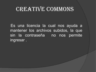 El documento describe los beneficios de Creative Commons y sus diferentes tipos de licencias. Creative Commons permite mantener archivos subidos en línea y protegerlos con contraseñas, y también ayuda a las personas a aprender a administrar mejor sus cuentas y subir archivos. Las licencias de Creative Commons incluyen Atribución, No Comercial e Igualmente Compartido.