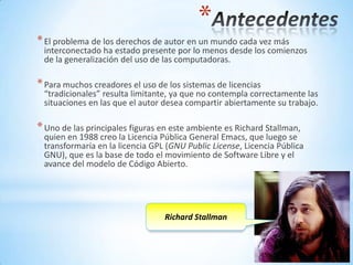 Creative Commons surgió para permitir el uso compartido de obras de forma sencilla a través de licencias estandarizadas. Ofrece varias licencias que combinan distintas condiciones como reconocimiento, uso no comercial y prohibición de obras derivadas. Wikimedia Foundation usa la licencia Creative Commons en todos sus proyectos como Wikipedia.
