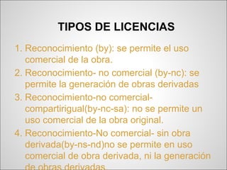 Las licencias Creative Commons ofrecen varios tipos de licencias que permiten a los creadores compartir sus obras bajo ciertas condiciones, como permitir usos no comerciales, requerir el reconocimiento de la autoría original, y permitir o no obras derivadas, garantizando así la difusión del conocimiento mientras se protegen algunos derechos de autor.