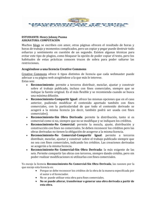 El documento habla sobre el plagio en blogs y páginas web. Explica que Creative Commons ofrece 6 tipos de licencias de contenido que los creadores pueden elegir para proteger su trabajo de manera legal. Luego describe brevemente cada una de las 6 licencias. Finalmente, el estudiante elige la licencia Reconocimiento-No Comercial-Sin Obra Derivada y explica sus razones para elegir esa licencia en particular.